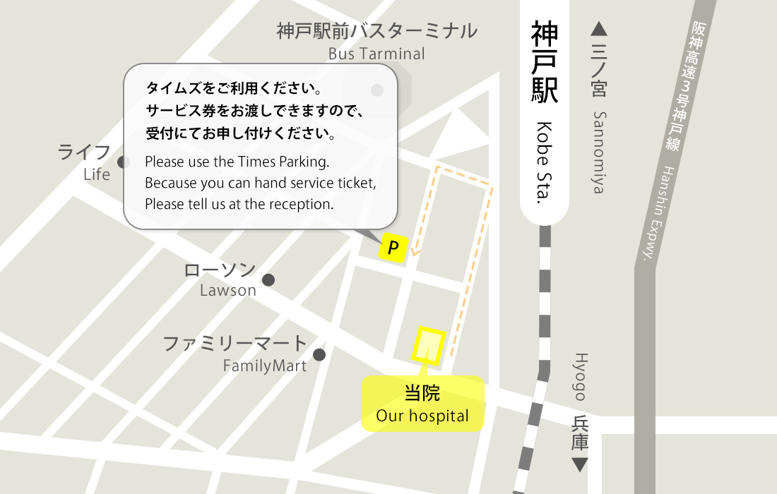 JR神戸駅・ハーバーランド駅から山側へ出て有馬道方面へ徒歩3分、高速神戸駅より徒歩5分